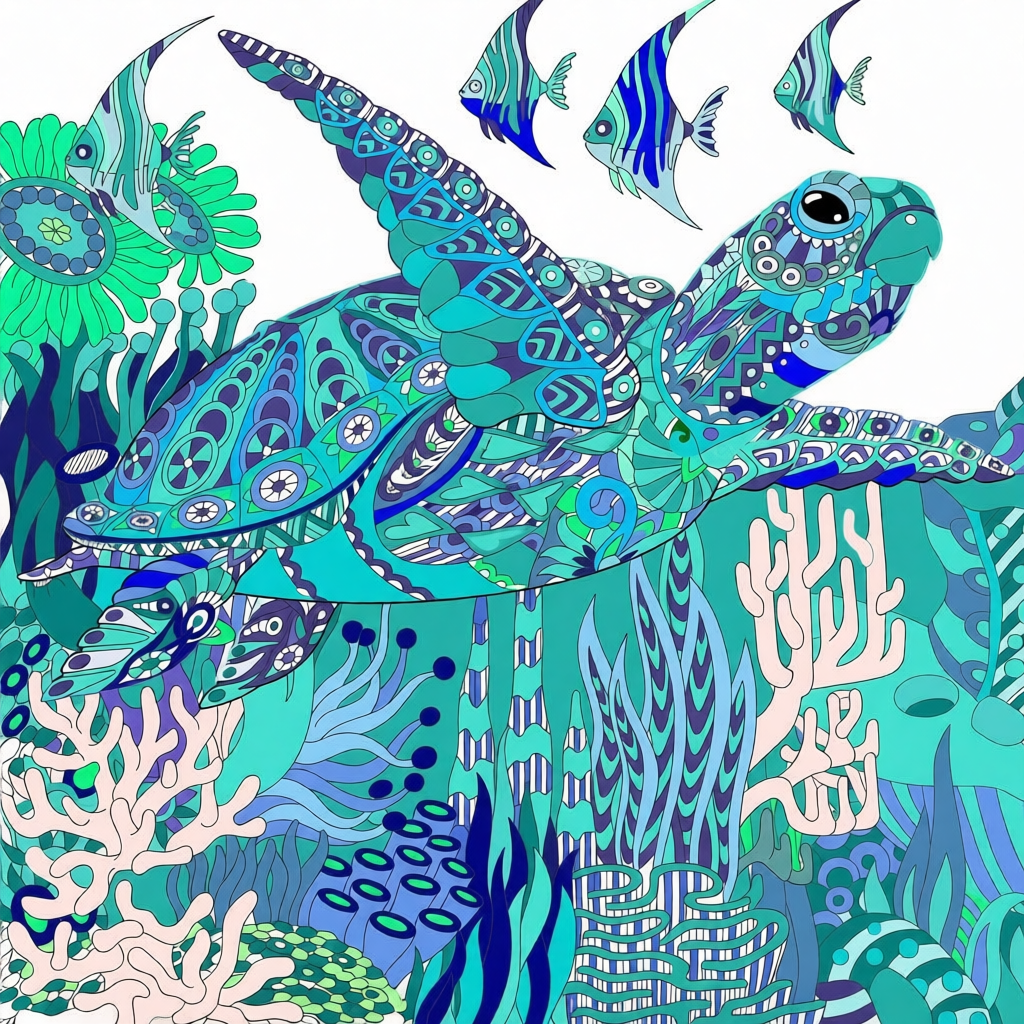 "Turtle Swim" Whimsical Design Print in 8 x 10 White Beveled Mat